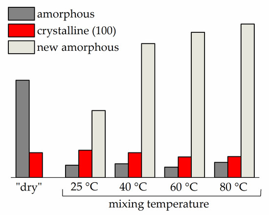 Amorphous and crystalline peak areas for Li-Nafion samples before and after swelling with an EC/SL mixture with ω(SL) = 0.2 at different mixing temperatures (specified in the diagram).