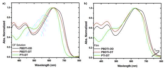 The absorption spectra of PBDTI-OD, PBDTI-DT and PTI-DT were taken both in CF solutions and as thin films, as shown in Figure 1a,b. The spectra of PBDTI-OD and PBDTI-DT in CF solutions are characterized by one dominant transition peaking at 631 and 628 nm, respectively, and two peaks below 450 nm. On the other hand, the absorption spectrum of PTI-DT is quite different from the BDT-based copolymers where a dominant one transition in solution that peaks at 615 nm and a modest peak at 450 nm are observed. The two-energy-band profile exhibited in PBDTI-OD, PBDTI-DT and PTI-DT is common in push–pull copolymers. The low energy band is due to the transition, usually with intra-molecular charge transfer (ICT) characteristics due to the charge transfer between the donor and acceptor moieties in the copolymers. On the other hand, the high energy band is due to the transition, which is common in the -conjugated polymers due to the alternating single and double bonds in their backbone [15]. The presumably assigned ICT state transition in PBDTI-OD and PBDTI-DT is red-shifted by more than 11 nm with respect to PTI-DT, suggesting a better electron-donating property of the BDT moiety [16]. This could also be due to the long alkyl side chains on the thiophene and isoindigo units of PTI-DT that can sterically intract, leading to a twisting in the backbone of the copolymer. Computaion analusis of a similar BDT-based copolymer showed that the copolymers are likely to adopt a planar structure [16] which facilitates ICT in PBDTI-OD and PBDTI-DT chains.