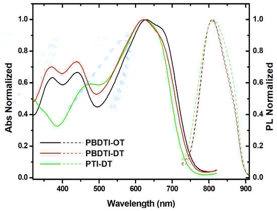 Absorption (solid line) and PL (broken line) spectra of PBDTI-OD (black), PBDTI-DT (red) and PTI-DT (green).
