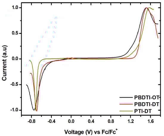 The HOMO and LUMO energy levels of the copolymers were determined using SWV from the onsets of their oxidation and reduction potentials, as shown in Figure 3. The HOMO and LUMO energy levels of the copolymers are summarized in Table 2. The difference in the HOMO levels between the copolymers with the same donor unit (PBDTI-OD and PBDTI-DT) was 0.2 eV, whereas the difference is only 0.1 eV between PBDTI-DT and PTI-DT (with the same acceptor unit). The highest LUMO level was found in PBDTI-OD, followed by PBDTI-OD and PTI-DT. The -electron density in the copolymers is not expected to be significantly affected by the alkyl side chains [22]. The reason for the difference in HOMO levels between PBDTI-OD and PBDTI-DT should, therefore, be due to the effect of the length of the alkyl side chains on the reorganization of the copolymers in the drop-casted films [8,19]. This is expected due to the relatively lower solubility of PBDTI-OD.