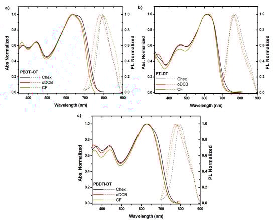 To further understand the photophysics of the copolymers, their absorption and PL spectra were recorded in CF, oDCB and Chex solution in a concentration range of 125–5.7 µg/mL. The absorbances of all the copolymers in the three solvents showed negligible shift with concentration gradient, which indicates the absence of aggregation in the solutions. The absorption spectra of the copolymers in the three solvents of different polarity are almost similar, with a slight difference in the apperance of a shoulder when the poor solvent (Chex) was used. However, the low-energy absorption peaks of the copolymers remained the same with increasing solvent polarity, as shown in Figure 4a–c (solid line). This confirms that the ground states (S) of the copolymers are non-polar. The PL spectra of PBDTI-OD showed a red-shift of 18 nm as the solvent polarity increased from 2.7 (oDCB) to 4.2 (CF). The Stokes shift of PBDTI-OD in Chex is higher than both oDCB and CF, despite its low polarity index of 0.2. Similarly, a 29 nm red-shift in PL of PBDTI-DT is found with increasing solvent polairty from 2.7 (oDCB) to 4.2 (CF). An ever larger Stokes shift in was observed when Chex was used as a solvent. The PL spectra of PTI-DT showed negligible shifts in the three solvents.