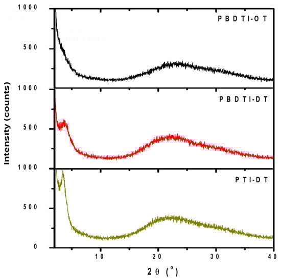 The structures of the copolymers were studied by powder XRD in drop-casted thin films, and the results are shown in Figure 6. The XRD traces of the three copolymers exhibit a broad peak (010) centered around 2 = 22° due to the stacking.