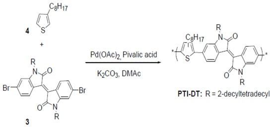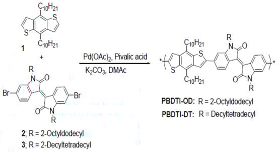 The synthesis of low-band-gap polymers using a simple and economically viable technique has gained the attention of researchers due to its potential for industrialization of the OSC technology. The direct arylation polycondensation method (DAP) has notably shortened the synthesis route compared to the commonly used Suzuki and Stille cross-coupling techniques. In this reaction, the unsubstituted arylene monomers are directly coupled with dihaloarylene units with the help of transition metals—usually palladium acetate. The by-product at each of the synthesis steps is, therefore, drastically reduced, making the DAP method more environmentally friendly and economically viable. In addition, the DAP method made the synthesis of polymers that were difficult to prepare with the traditional Suzuki and Stille cross-coupling techniques possible [3]. The mass production of OSCs will need an enormous amount of donor and acceptor organic materials. An easy and fast synthesis method such as DAP is undoubtedly important in the realization of the commercialization of OSC technology. Despite its many interesting merits, the method has a drawback: its selectivity between C–H bonds for some monomers is poor. Consequently, the method is more commonly used to synthesize homopolymers like poly-3-hexylthiophene (P3HT) and benzodithiophene (BDT) [4,5,6]. However, D–A copolymers synthesized by DAP method are limited. Recently, our group and others have reported the successful synthesis of D–A copolymers using the DAP method [7,8,9,10].