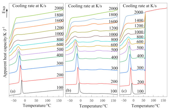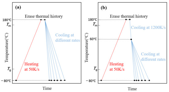 FSC can provide an extremely fast cooling rate that inhibits any ordered process, i.e., crystallization. The rate at which cooling crystallization is precisely inhibited is called the critical cooling rate. Thus, the crystallization of the PLLA block can be inhibited when the cooling rate is higher than the critical rate to 60 °C [14], so that the PLLA block crystallized together with the PEG block in the process from 60 °C to −80 °C. Therefore, we used two different cooling methods to study PEG-PLLA (methods 1 and 2) and used method 1 for PEG. Method 1: cool directly from 180 °C to −80 °C, as shown in Figure 1a; Method 2: cool from 180 °C to 60 °C, cooling to −80 °C, respectively, by more than the critical cooling rate (2000 K/s) and cooling rate for studying, as shown in Figure 1b. The heating rate is 50 K/s, isothermal at 180 °C for 1 s to erase the thermal history.