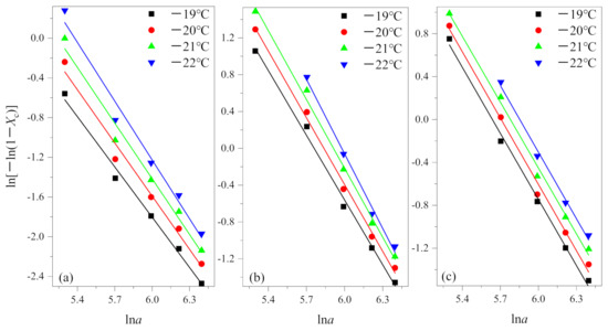 In the actual measurement, the relative crystallinity was selected at a given temperature T and different cooling rates from the non-isothermal crystallization curves. According to Equation (3), the results of the Ozawa analysis are shown in Figure 3 by plotting ln[−ln(1−Xc)] versus lna for crystallization temperature at −19 °C, −20 °C, −21 °C and −22 °C. Then, K(T) and q are determined by the intercept and slope, respectively. The results are summarized in Table 2.
