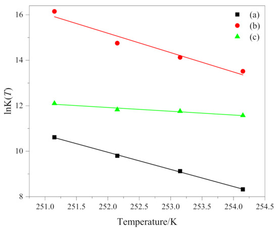 lnK(T) as a function of temperature T of (a) PEG in method 1, (b) PEG-PLLA in method 1 and (c) PEG-PLLA in method 2.