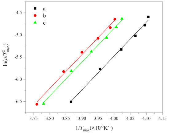where R is the gas constant (8.314 J/(mol·K)), ΔE is the activation energy. According to the results in Table 1, the curves of ln(a/) and 1/Tmax are drawn, as shown in Figure 5. The crystallization activation energy can be obtained from the slope, i.e., . The Kissinger plot gave a series of parallel lines with a slope and an intercept of function.