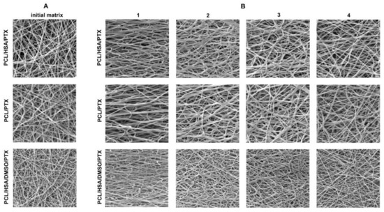 According to SEM data, all matrices were composed of randomly oriented fibers (Figure 1A). The SEM reveals the smooth surface of the fibers. The composition of the ES solution influenced the structure of the matrices. The addition of DMSO in the ES solution resulted in a decrease in fiber diameter. The decrease in fiber diameter for matrices containing DMSO was also shown for PCL-based matrices containing sirolimus [23].