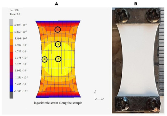 (A) A graphical representation of the sample deformation with control points. The numbers represent the regions of the matrix in the various positions of the extended matrix. (B) The device used for the elongation of matrices with the elongated sample.