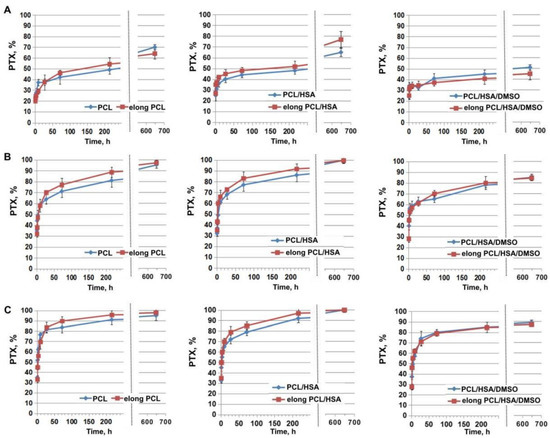 The kinetic curves of PTX release from intact and elongated matrices. The illustrations show incubation of the matrices in (A) PBS without medium replacement; (B) blood plasma (BP) without medium replacement; (C) BP with medium replacement.