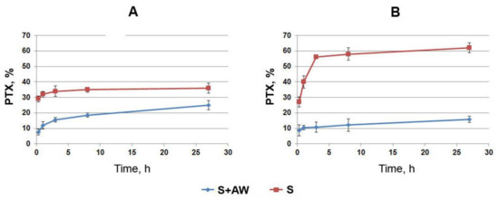 The kinetics of PTX penetration through the arterial wall. The PTX-eluting stents covered with the arterial wall (S+AW) or noncovered PTX-eluting stents (S) were incubated in (A) PBS or (B) BP.