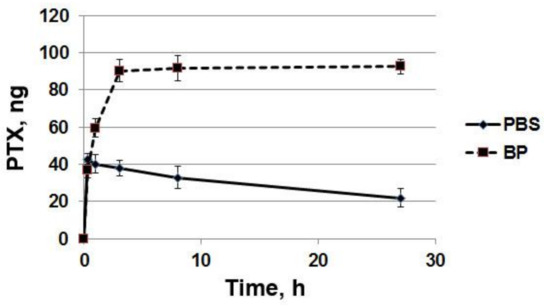 The PTX release into the PBS seems to be connected with the accelerated diffusion of soluble PTX-binding components like human serum albumin present in the arterial wall compared to their diffusion into BP. HSA binds paclitaxel with a binding constant of 1.43 × 104 M−1 [29]. The plasma albumin concentration normally ranges from 35 to 50 g/L [30], and 60% of the albumin is located in the interstitial and intracellular space [31]. Thus, HAS could be considered as a potential candidate as a PTX transporter in PBS but not in BP.