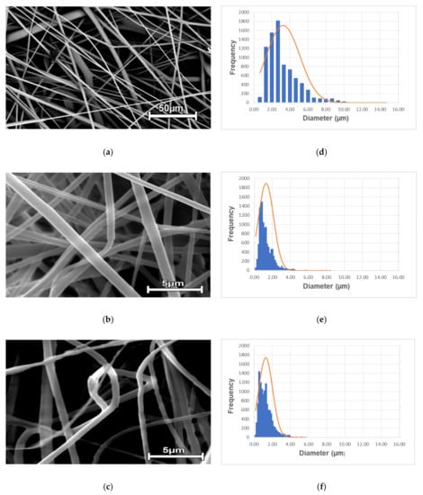 SEM images of electrospun recycled PET fibers: PET20_0.8 (a); PET12_0.8 (b) and PET12_1.0 (c), with their respective fiber size distribution (d–f).
