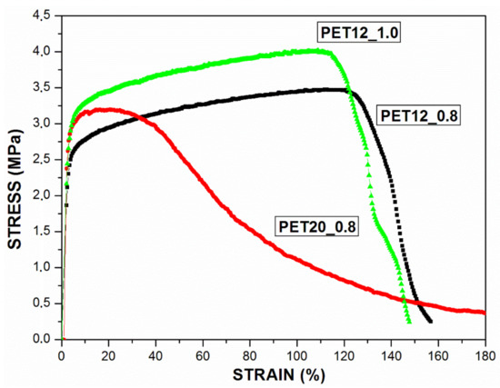 The tensile strength can be determined by the maximum point of the curve and translates into how much the material can withstand the stress being applied. The tensile strength reached 3.2 MPa, 3.5 MPa, and 4 MPa, for samples PET20_0.8, PET12_0.8, PET12_1.0, respectively.