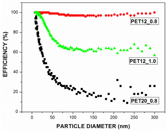 Therefore, knowing the concentration of the NaCl nanoparticles before and after passing through the filter media, it is possible to determine the overall and fractional efficiency of the nanoparticles of the filter media produced in this study. Figure 3 shows the efficiency curves as a function of the diameter of the nanoparticles. Sample PET12_0.8 (red curve) had a 98.4% overall efficiency, while samples PET12_1.0 (green curve) and PET20_0.8 (black curve) presented values of 76.8% and 38%, respectively (see Table 3). Due to the high fiber diameter obtained in PET20_0.8, the diffusion filtration mechanism characteristic of this nanoparticle size range was negatively affected reducing the global efficiency [36], as can be seen in Figure 3 which shows that, the efficiency decrease as the particle diameter increase.