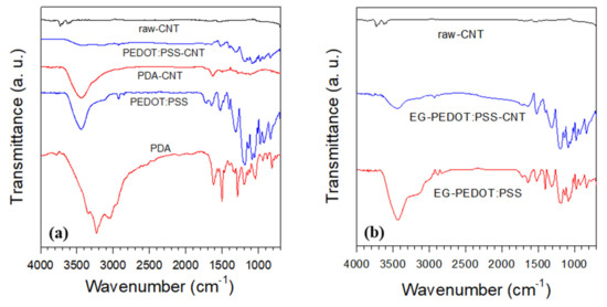 FT-IR curves of (a) raw-CNT, PDA, PEDOT:PSS, PDA-CNT, and PEDOT:PSS-CNT, and (b) ethylene glycol (EG)-PEDOT:PSS and EG-PEDOT:PSS-CNT.