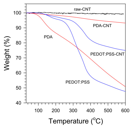 TGA curves of raw-CNT, PDA, PEDOT:PSS, PDA-CNT, and PEDOT:PSS-CNT.