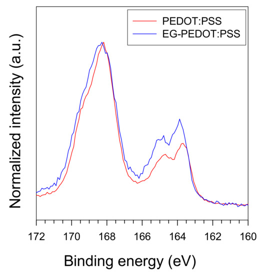 The XPS spectra of sulfur 2p (S 2p) for pristine PEDOT:PSS and EG-treated PEDOT:PSS samples are shown in Figure 6. The lower-binding energy peaks at 163.5 eV correspond to the sulfur atom of the PEDOT. The higher-binding energy peaks near 168 eV correspond to neutral and ionic sulfur in the PSS dopant [22]. According to the height ratio of PSS to PEDOT for the pristine sample, the concentration of PSS dopants in PEDOT is estimated to be ~2.6. The high PSS dopant ratio of the samples originates from the increase of the number of dopants on the sample due to the relatively large size of the PSS chain. The ratio of PSS to PEDOT decreased to ~2.2 after the EG treatment, owing to the depletion of the PSS chains from the PEDOT:PSS [50]. The EG induced a screening effect between the positively charged PEDOT chains and negatively charged PSS chains, reducing the Coulomb interaction between them [22]. In addition to XPS, Raman spectroscopy is also very useful in chemistry to study the doping behavior of conjugated polymers [51,52]. The conformational change of the PEDOT chain in the PEDOT:PSS film caused by the EG treatment can be detected via Raman spectroscopy. As reported in the literature, the benzoid structure may be a preferred structure for the coil conformation of PEDOT:PSS, and the quinoid structure may be the preferred structure for the linear or expanded-coil conformation of EG-PEDOT:PSS [16,53]. Therefore, it can be inferred from XPS and Raman spectroscopy that higher PEDOT domains caused by the segregation of the excess PSS and the conformational change of the PEDOT chains from a coil structure to an extended coil or linear structure lead to higher conductivity. The sheet resistances of spin-coated PEDOT:PSS and EG-PEDOT:PSS films were measured, as summarized in Table 1. By adding a small amount of EG as an additional dopant, the sheet resistance of the PEDOT:PSS film was reduced to approximately1/20–1/50. The decreasing tendency of the sheet resistance was more pronounced when a higher EG content was used, and a lower coating speed was applied.
