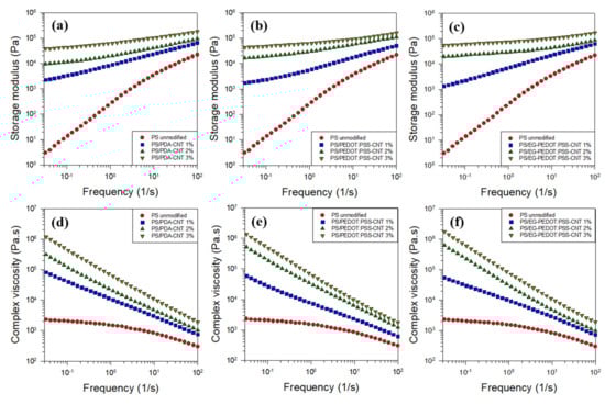 Rheological properties (storage modulus G′ and complex viscosity η*) of PS/CNT nanocomposites with (a,d) PDA-coated CNTs, (b,e) PEDOT:PSS-wrapped CNTs, and (c,f) EG-PEDOT:PSS-wrapped CNTs.