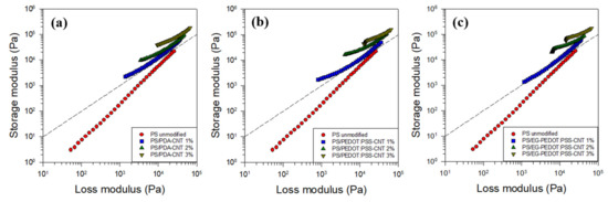 Storage modulus G′ vs. loss modulus G″ of PS/CNT nanocomposites with (a) PDA-coated CNTs, (b) PEDOT:PSS-wrapped CNTs, and (c) EG-PEDOT:PSS-wrapped CNTs. The dashed line represents G′ = G″ and is for visual guidance.