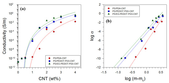 The electrical conductivity of the PDA-CNT, PEDOT:PSS-CNT, and EG-PEDOT:PSS-CNT nanocomposites was measured to investigate the electrical properties of the nanocomposites. Figure 11 shows the electrical conductivity with respect to the modified CNT content for each nanocomposite. When small amounts of the conductive CNTs were added to the insulating PS matrix, the electrical conductivity did not change significantly (approximately 10−11–10−10 S m−1). After a certain content of CNTs was reached, the electrical conductivity increased rapidly, and as the content was continuously increased, the rate of increase decreased gradually. The point at which the electrical conductivity changes abruptly is the electrical percolation threshold, where the microstructure of the material begins to form a CNT network, i.e., an electrically conducting channel. At concentrations lower than the percolation threshold, the network structure is not formed, and electrons cannot flow, but at concentrations higher than the threshold, network structures can form, and electrons can flow. The electrical percolation threshold can be estimated using the following power–law relationship [54].