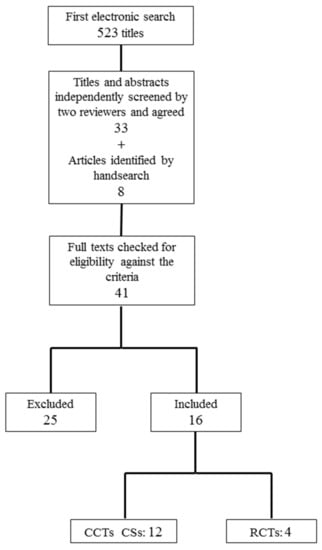 The electronic search was performed in January 2021, resulting in 523 articles. After duplicate removal and the reading of titles and/or abstracts, 41 articles were selected. A manual search identified eight more manuscripts. Then the full-text of all the selected articles was reviewed for the inclusion criteria. Then, 25 articles were excluded after full reading, and 16 articles were then included in the final selection. A flowchart of the selection and inclusion process, based on PRISMA recommendations is presented in Figure 1. The extracted data for each reviewed article are shown in Table 1.