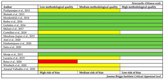 Studies’ quality assessment and risk of bias following: Newcastle–Ottawa scale for interventional and observational assays. Studies were considered as having a high (green), medium (yellow), or low (red) methodological quality, and the Joanna Briggs Institute Critical Appraisal tool for case series. Studies were considered as having high (red), moderate (yellow), or low (green) risk of bias.