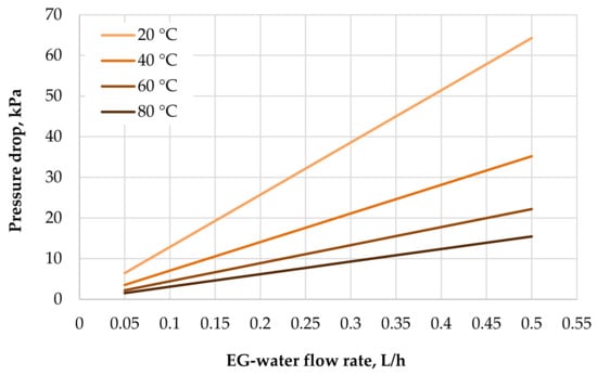 Friction pressure drops vs. flow rate of 50% EG (ethylene glycol) and water flowing in fiber (0.05–0.5 L/h solution flow rate, solution temperature 0–80 °C, fiber inner diameter 0.64 mm, 500-mm-long single fiber). Data computed according to Equation (2).