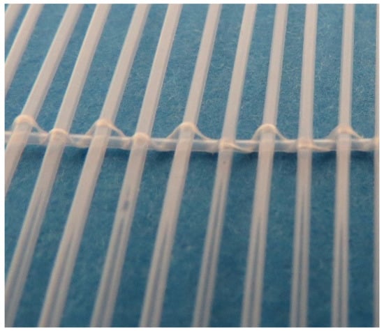 A new type of polymeric heat exchanger for automotive applications was developed and constructed by the Heat Transfer and Fluid Flow Laboratory at the Brno University of Technology, Czech Republic. The polymeric hollow fiber heat exchanger consists of 12,240 fibers with a length of 480 mm. The polymeric hollow fibers were produced in the laboratory via a hotmelt extrusion of granules of high viscose polyamide 612 produced by DuPont (Zytel LC6159, Wilmington, DE, USA). This material was chosen because of the relative ease of extrusion to form a uniform and high-quality wall in the final product. Also, this material has a relatively high melting point of 216 °C and the temperature of deflection under a load of 0.45 MPa is 150 °C. This means that even at this temperature the wall still retains its strength characteristics. This is very important for this work since the temperature of the working fluid can reach 120 °C. The outer fiber diameter was 0.8 mm and the inner diameter was 0.64 mm. A 5% variation in the diameter is common due to extrusion. As the wall thickness was small (about 0.08 mm) it was not necessary to use more expensive polymers with higher thermal conductivity for the air–water application. The main thermal resistance in this case will occur at the wall–air interface, and thus the thermal conductivity of the wall does not play a significant role in heat transfer [3]. The area of the heat transfer surface was 12.92 m2. The fibers were distributed in 34 layers of 360 fibers. The fibers in the layer were woven together using a textile fiber and polypropylene tubing with an outer diameter of 0.6 mm (detailed in Figure 3) which was attached perpendicularly to the active hollow fibers. This polypropylene tubing also provided spacing between the layers of the heat exchanger. The frame of the heat transfer core and manifolds was made of plastic reinforced with glass fiber. The assembled polymeric car radiator is shown in Figure 4.