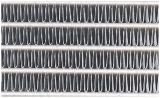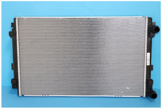 The polymeric HX was designed and built to replace the metal radiator (see Figure 5) in a Skoda Octavia (Skoda, Mladá Boleslav, Czech Republic) with a 3rd generation 1.4 L turbocharged stratified injected (TSI) gasoline engine with a maximum power of 110 kW. A photo of the heat transfer surface of the tested radiator from Octavia is shown in Figure 6. The heat transfer surface is made of sinusoidal louvered aluminum fins that were brazed to flat aluminum tubes in an inert atmosphere.