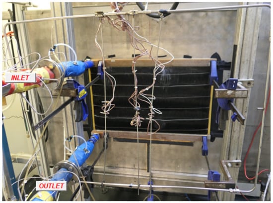 A mixture of 50% water and 50% ethylene-glycol (Chevron, San Ramon, USA) was used as a radiator coolant for testing. The input liquid temperature was 90 °C and the intake air temperature was 30 °C. The tests of the polymer radiator were carried out with air velocities of 1, 2, 3, and 4 m/s and liquid flow rates of 15, 30, 45, and 60 L/min. The tests with the metal radiator were carried out with air velocities of 2, 4, and 6 m/s and liquid flow rates of 30, 60, and 90 L/min. Installation of the polymeric radiator in the test bench is shown in Figure 7.