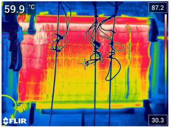 The thermal outputs were computed based on results measured on both the air and the liquid sides. The thermal balance errors obtained from the measurements of the air side and liquid side were less than 3%. Figure 8 shows the surface temperature distribution of the polymer radiator during testing. It is obvious that the inlet manifold is located on the top. The inlet and outlet in the used prototype are shown on the left side of the radiator and it was evident that the fibers on the left side of the radiator featured a higher temperature. A few fibers in the right part of the figure were cold (blue area) which indicated that they were blocked during prototype production.