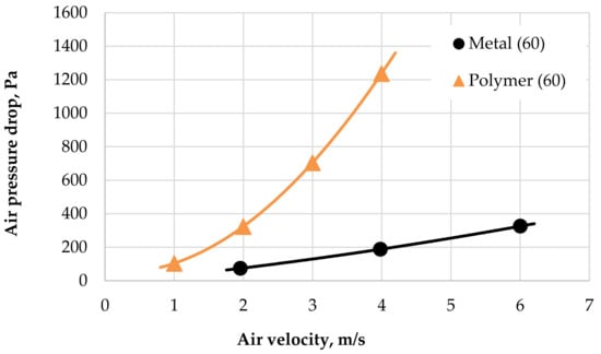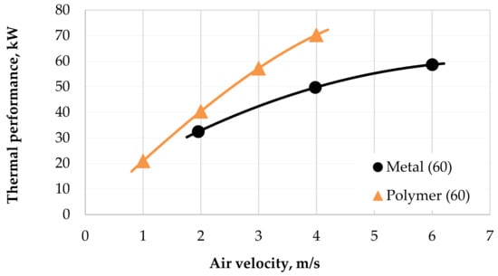 The performance and pressure drop data taken from the experiments with both heat exchangers are presented below. The performance parameters depended on the air velocity through the radiator as shown in Figure 9. Data are shown for a coolant flow rate of 60 L/min. It can be seen that for an air velocity higher than 2 m/s, the PHFHE has 25% better thermal performance than the metal HX. With an increase in air velocity to 4 m/s, the difference in thermal performance between the PHFHE and metal HX increases to almost 30%.