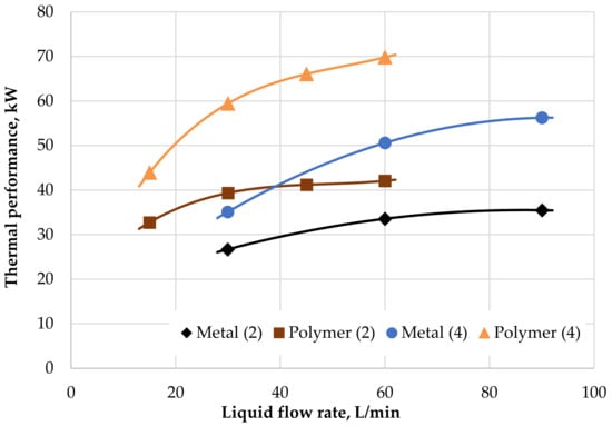 A comparison of the influence of thermal performance rate on the coolant flow rate in both radiators is shown in Figure 10, where the results for air velocities of 2 m/s and 4 m/s are shown. The graph shows that for an air velocity of 2 m/s and for liquid flow rates less than 40 L/min that the PHFHE has better thermal performance than the metal radiator, even for an air velocity which is twice as high, i.e., 4 m/s. The maximal thermal performance for the PHFHE was 70 kW with a liquid flow rate of 60 L/min and air velocity of 4 m/s.