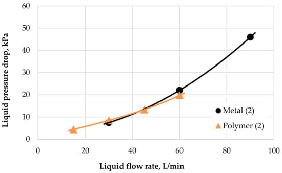 Figure 11 shows that the hydraulic characteristics on the liquid side for both radiators were similar. Hydraulic losses should be discussed carefully. The results shown in Figure 11 represent identical inlet liquid temperatures of 90 °C for both radiators. It can be seen that the PHFHE’s curve is flatter. As mentioned previously, this is because there is always laminar water flow inside the hollow fiber for this condition. For laminar liquid flow, dependence between the pressure loss and the flow rate was linear. A slight turbulent behavior of the liquid flow is achieved only in the inlet and outlet header of the heat exchanger, which explains its larger cross-section. The mostly laminar nature of the liquid flow inside the PHFHE leads to the fact that at a higher flow rate, the pressure drop of metal HX would be higher than that of polymer HX.