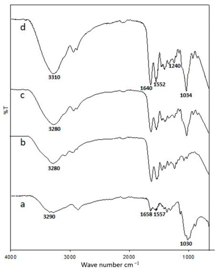 Attenuated total reflectance (ATR) spectra of (a) chitosan membrane, (b) gelatin membrane, (c) 1:7 chitosan–gelatin membrane (without crosslinking), and (d) 1:7 genipin-crosslinked chitosan–gelatin membrane.