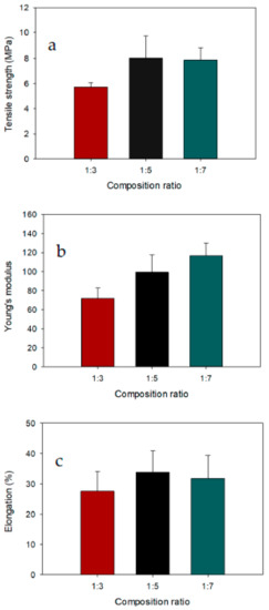 (a) Tensile strengths, (b) Young’s modulus, and (c) elongations at break (%) of modified chitosan–gelatin membrane foam with different chitosan:gelatin composition ratios.