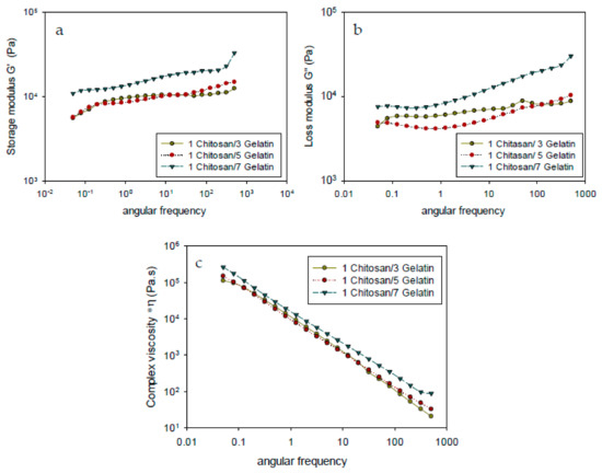 Rheological properties of modified chitosan–gelatin membrane foam with different composition ratios of chitosan:gelatin: (a) storage modulus (G’), (b) loss modulus (G”), and (c) complex viscosity (*η).