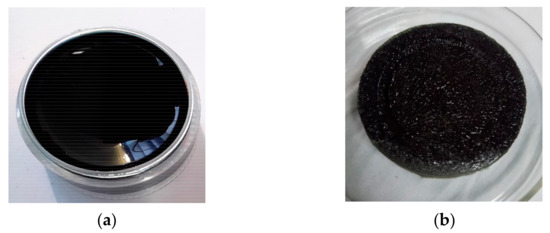 The successful crosslinking of the chitosan–gelatin membrane with genipin was verified by the change in the color from transparent to dark blue. The photographic images of the hydrogel and membrane foam are shown in Figure 4. The hydrogel (Figure 4a) presents sample conditions after crosslinking and before the hydrogel was lyophilized. Then, the sample underwent a sublimation process to form a membrane. Previous research also reported that the formation of a deep blue pigment in the hydrogel during the process is a strong indication of a successful reaction between the primary amine groups of chitosan, gelatin, and genipin [15]. The hydrogel formed with sufficiently high interaction between chitosan, gelatin, and crosslinking genipin shows a clear dark blue color, is stable and stiffness, and can be used for further investigation and applications [31].