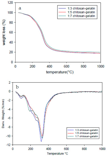 (a) Thermogravimetric analysis (TGA) and (b) derivative thermogravimetry (DTG) curves of the modified membrane foam in the chitosan:gelatin composition ratios of 1:3, 1:5, and 1:7.
