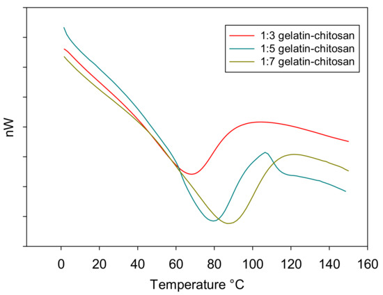 Differential scanning calorimetry (DSC) curve of the modified membrane foam at chitosan:gelatin composition ratios of 1:3, 1:5, and 1:7.