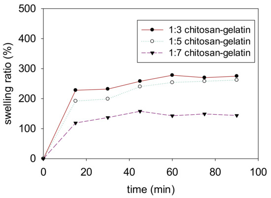 The chitosan–gelatin membrane sample with a higher gelatin content had a compact scaffold structure with decreased porosity, as shown in Figure 5c. This might be related to the higher content of gelatin, which tends to form membrane structures through crosslinking. The higher gelatin content in the membrane corresponded to more crosslinking points; therefore, the small structure pores linked together and produced more structural inner pores, inducing the formation of the smallest pores compared with the membranes with low gelatin content. In contrast, the membrane structure containing a lower content of gelatin formed large-dimension pores in the scaffold structure, which led to a slight increase in the pore size. As higher gelatin content in the composition conveyed higher mechanical strength, a membrane with a composition ratio of 1:7 also retained its original structure after the swelling test. The increase in the gelatin content enhanced the scaffold porosity structure.