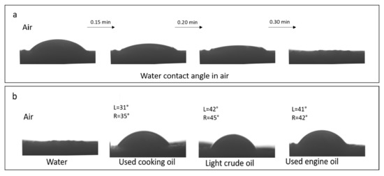 The oil–water separation performance was analyzed to determine water permeability and oil resistance of the biopolymer membrane. The (1:7) chitosan–gelatin membrane with good water absorption, which was employed in this study, is a promising candidate for application in oil–water separation. Figure 9a shows the wettability test of the sample with water; Figure 9b shows the membrane testing results with different types of oil with water as a reference. Table 2 presents the average viscosity of each oil used in the study. The water contact angle was used to measure the wettability of the gelatin–chitosan 1:7 membrane foam in air with a 5 μL water droplet. As shown in Figure 9a, when the water droplet comes in contact the membrane foam surface, it takes a certain amount of time to spread completely on the surface, and it permeates into the sponge within 30 min. Therefore, the water contact angle is 0°. The hydrophilicity of the membrane foam produced is due to the strong intra- and intermolecular hydrogen bonding. The strong affinity of hydrogen bonding toward the water molecules and the external surface of the membrane results in uniform spreading and absorption of the membrane foam. However, when water was replaced with various oil droplets to study the wetting behavior, the spreading and adsorption differed. For each sample of oil used in application testing, a certain amount of oil (5 μL), the results show that oil droplets remain at a certain point on the membrane surface after 30 min. The results indicate that the membrane surface is oleophobic in air, with varying oil contact-angle values for used cooking oil (L = 31°, R = 35°), light crude oil (L = 42°, R = 45°) and used engine oil (L = 41°, R = 42°). All the oil contact angles on the membrane foam confirmed the oleophobic properties and indicated a stable membrane foam in a wide range of oil viscosities. The differences in the contact angle were a result of the roughness of the real surface of the membrane produced. The roughness resulted in an enlarged surface area and effected the wettability properties of the membrane. The contact angle was smaller on a rough material so the material was, therefore, even more wettable. This observation indicated the potential of the membrane for application in oil–water separation. In addition, oil droplets trapped at the membrane surface under water were observed in the membrane foam. This indicated that the chitosan–gelatin membrane foam was oleophobic under water. These wettability behaviors for different oils indicated the affinity of the membrane surface toward selective absorption and permeation of water.