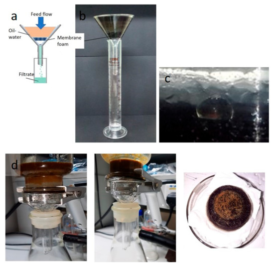 (a) Oil–water separation process using a funnel. (b) Membrane used to filter light crude oil–water. (c) Oil droplets in water at the membrane surface. (d) Used engine oil–water mixture before and after the separation; photograph of the membrane after the separation.