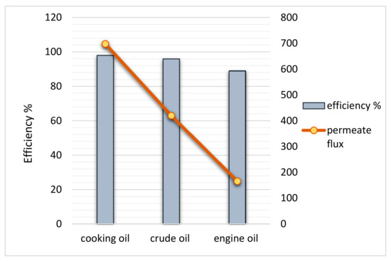 As shown in Figure 11, the initial flux results for application testing of mixture used cooking oil–water at a rate of 698 L∙m−2∙h−1, the mixture of light crude oil–water resulted in a rate of 420 L∙m−2∙h−1 fluxes yield. Meanwhile, for the used engine oil separation process, it is clear that the lowest flux yield was at 166 L∙m−2∙h−1. The separation pattern of the used cooking oil was much faster compared to light crude oil, even though the viscosity of the used cooking oil was slightly higher. This is because used cooking oil has highly concentrated oil and fat; therefore, water contaminated with this oil can be separated easily as the oil remains separated from the water [39]. The separation efficiency depends on the natural state of the oil and the feed viscosity during the separation process. However, the use of a light crude oil mixture for separation has a tendency to reduce the separation rate as the light oil due to the mixture of oil water and light crude oil turning into the emulsion in a significantly low viscosity was reflected by its surface tension and dispersed phases in water. Since water is the rich phase in the mixture, the light oil is significantly influenced by the hydrogen bonds and hydrodynamic forces [44]. The highly viscous feed increases the total resistance in the separation process. The lowest flux yield is obtained from the used engine oil–water mixture. The highly viscous used engine oil may contain toxic chemicals that can adhere to everything and cause contamination; therefore, it considered as the root cause of pollution. The separation becomes difficult because the engine oil is very viscous, and the contaminated water contains high oil content. Water contamination with the used engine oil can easily cause membrane fouling during the separation process, which tends to decrease the flux and efficiency of separation. Therefore, for a highly viscous oil–water contamination separation process, the membrane undergoes a cleaning process for the reusability of the membrane due to its hydrophilic properties by washing the membrane with water and soap to remove oil on the membrane surface. The hydrophilic membranes experienced a lower decrease in the overall flux as compared to the hydrophobic membranes clogging the separator with oil because of the high concentration of the oil, which indicates a higher resistance to oil–water filtration [45,46]. Oil adhering to the surface reduce the performance and reusability of the membrane. Utilizing a bio-membrane is one of the effective methods to improve the fouling behavior of the membrane to overcome the material’s resistance to fouling due to this membrane can be cleaned to remove material that causes it to clog by cleaning the surface removing oil contaminations. To clean the grease/oily membrane, especially when contaminated with high-viscosity used engine oil (Figure 10d), only soap and water are required. Squirt a tiny drop of liquid soap on the membrane and gently wipe the surface until the oil disappears; rinse with water. The cleaned membrane can be used several times, without causing any significant decrease in separation efficiency. The membrane must also be cleaned before disposal, if disposal as solid waste is desired.