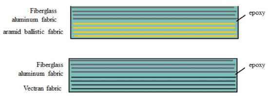Each plate had dimensions of 40 × 40 cm and consisted of four layers of fiberglass aluminum fabric along with aramid ballistic fabric and Vectran fabric, respectively, as shown in Figure 1.