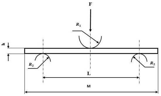 The three-point bending tests were conducted with an Instron 5940 universal testing machine, per EN-ISO 178:1996. The applied velocity of the bending load was 2 mm/min. Figure 2 shows the loading configuration for a beam in a three-point bending test, where F is the applied force, R1 is the indenter radius, R2 is the fixed support radius, h is the specimen thickness, L is the support span and M is the specimen length. Load-displacement plots were obtained for each test specimen. Specimen dimensions were approximately 50 × 15 × 2.5 mm3.