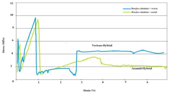 The calculated mechanical properties from three-point bend testing are shown in Table 2. The properties shown corroborate the above stated analysis for the superior response of the Vectran-based hybrid composites. Notably, they also show superior damage tolerance by exhibiting a higher residual fracture stress after the main peak, as shown in Table 2.