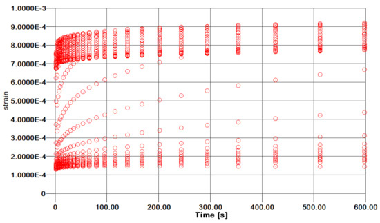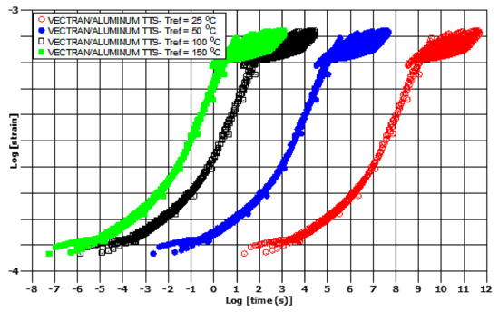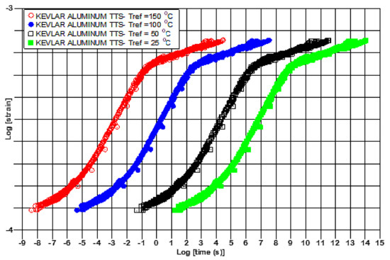 Creep compliance testing was conducted at different stress levels so as to obtain a cloud of curves over time, as shown in Figure 4 for the Kevlar/aluminum–glass hybrid composite specimens. Evidently, the curves approximately show the self-similarity which is required to proceed to TTS modeling of the specimen’s creep response. The authors do not wish to refer analytically to TTS theory for polymers and composites, as it is given in the open literature in full detail. The TTS, or time–temperature superposition principle (TTSP), is widely used in the long-term characterization modeling for polymers [21,22,23] and composite materials [24,25,26], and also their stability response over aging effects [27,28].