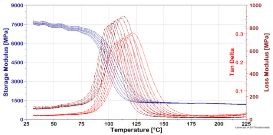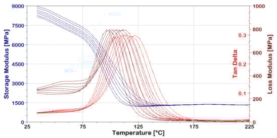 DMA spectra are shown in Figure 12 and Figure 13 for the Kevlar/aluminum and Vectran/aluminum–glass composite hybrid specimens, respectively. As already mentioned, they present the dynamic viscoelastic constants of the materials over a given range of temperatures and frequencies.